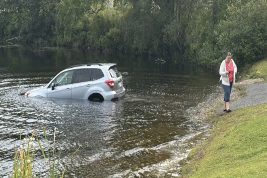 An image shared by Melugin shows the woman solemnly looking down at her phone while the submerged vehicle could be seen in the background.