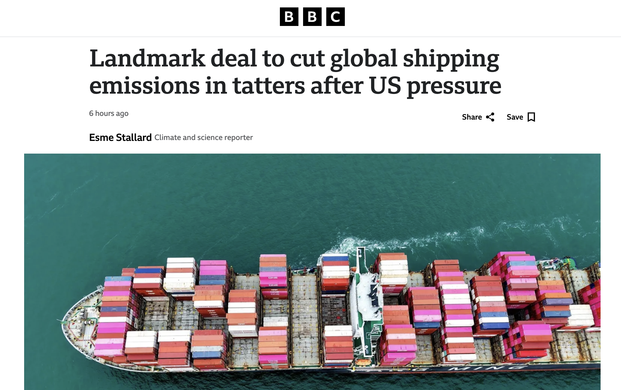 BBC excerpt: A landmark deal to cut global shipping emissions has been abandoned after Saudi Arabia and the US succeeded in ending the talks.