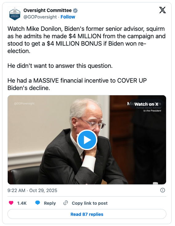 Further, contingent upon a reelection victory for President Biden in the 2024 general election, Donilon would have received an additional $4 million. Donilon stood to make $8 million by keeping President Biden in the race and, because he was paid monthly, just one more month of President Biden’s campaign meant even more money for Donilon.