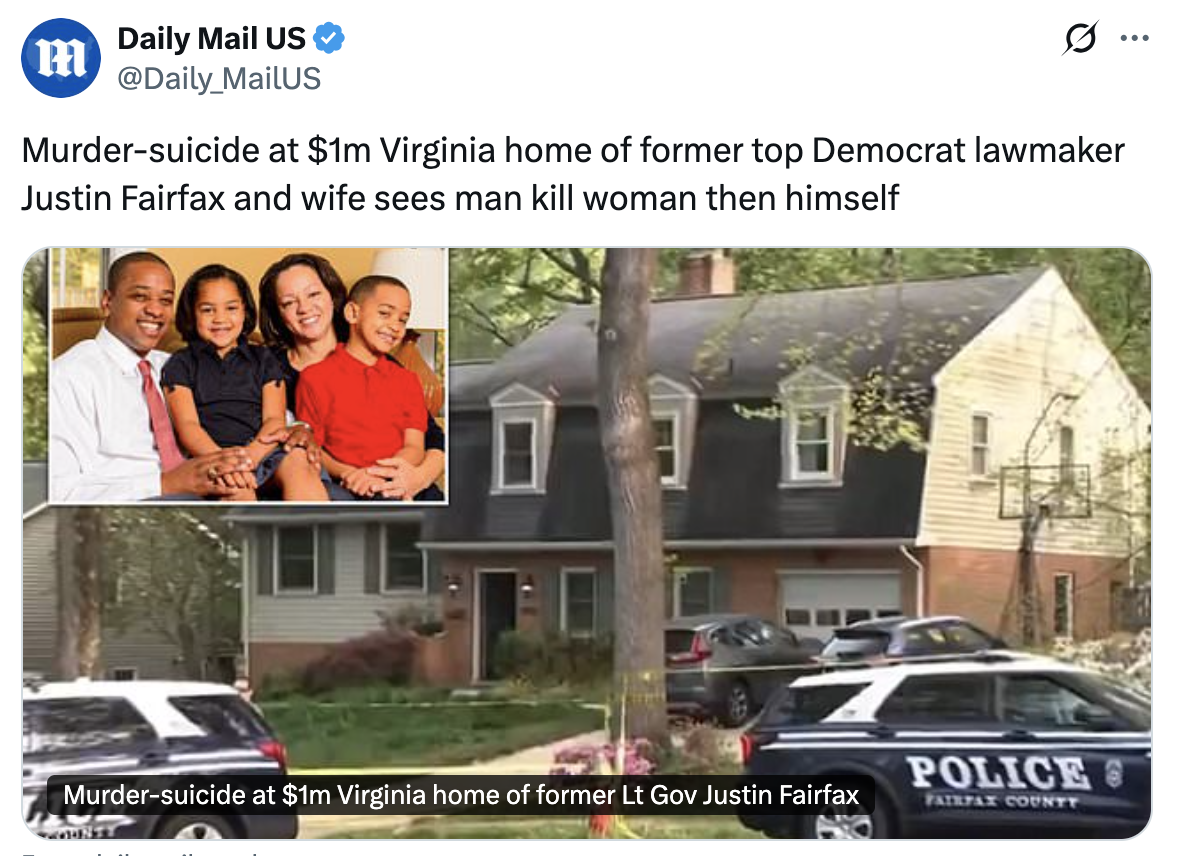 Former Virginia Lt. Gov. Justin Fairfax is dead after what police say was a murder-suicide that unfolded inside his Fairfax County home early Thursday.