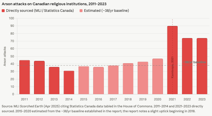 Between 2011 and 2014, Canada averaged roughly 39 arson attacks per year on religious institutions. In 2021 that figure jumped to 90. It held at 74 in both 2022 and 2023. A 2025 Macdonald-Laurier Institute report (the first serious empirical investigation of the wave) confirmed that arson against Canadian houses of worship had more than doubled as a share of all arson nationally, from 0.38% to 0.73%. In raw terms: at least 44 churches burned to the ground between 2021 and 2024, 123 churches have been vandalized, torched, or desecrated since that summer, and 238 arson attacks hit religious institutions in 2021–2023 alone, up from 152 in the prior three-year period.