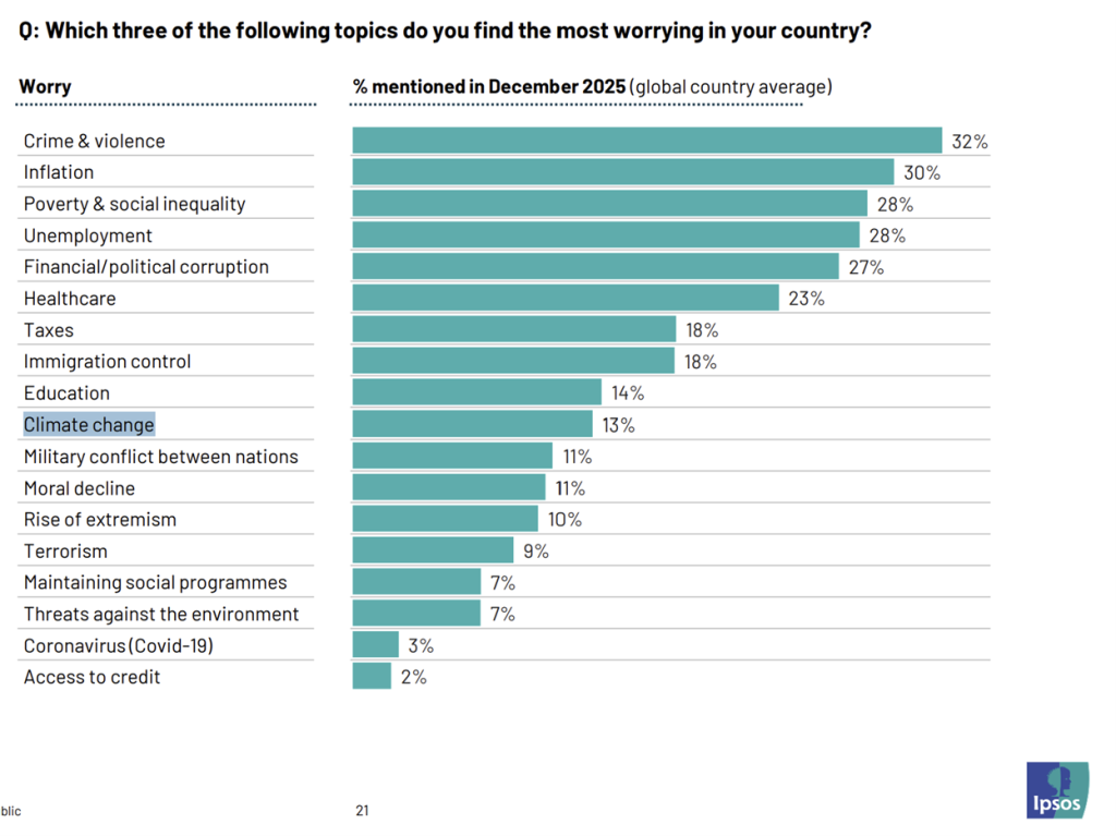 Ipsos, a market research company the WEF frequently uses, reports in their annual “What Worries the World?” survey that climate change barely makes the top 10 issues most people in the world are concerned about. (see the graph, below)