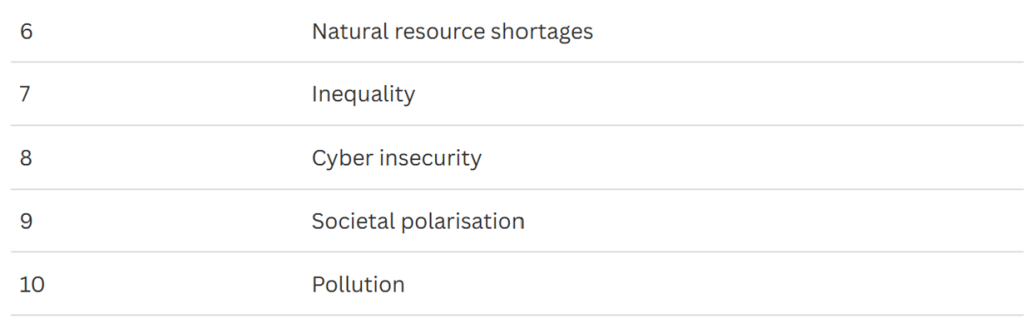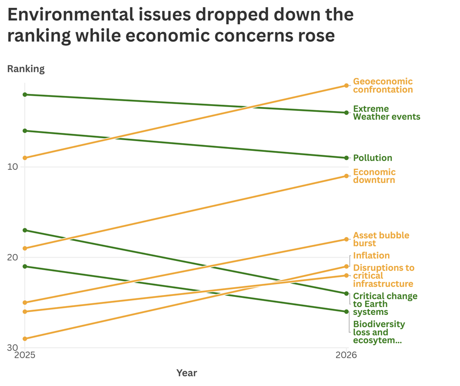 The article, titled “Ahead of Davos, climate drops down global elite’s list of pressing concerns,” was written before the Davos event kicked off Monday, January 19, and focuses on a survey conducted by the WEF’s Global Risks Perception Survey of “experts” and leaders in advance of the meeting. This year, the survey found that for the first time in years, “climate change, pollution, and biodiversity loss have dropped down an international ranking of short-term concerns for high-profile business leaders, academics, and politicians,” as priorities shifted towards more concern over “economic risks like geoeconomic confrontation, economic downturn, inflation, and asset bubbles bursting.” (See the graph, below, from the WEF).