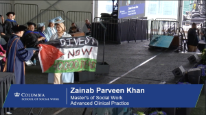 When she graduated from the Columbia School of Social Work in May 2024, Khan waved a Palestinian flag with “Divest Now” scrawled on it while crossing the commencement stage.