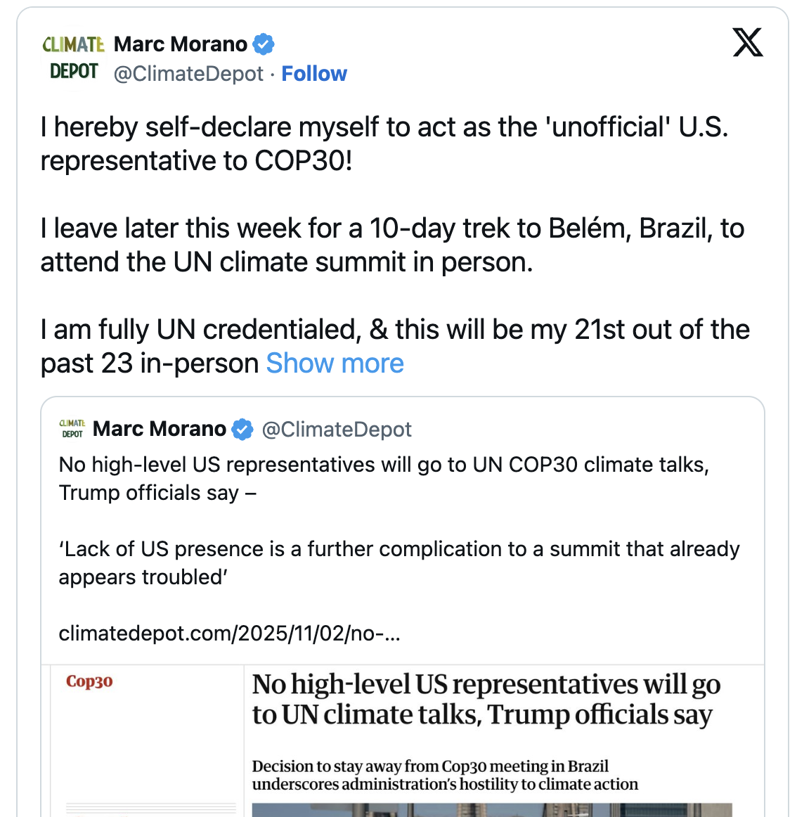 Morano Note: I will be heading to Belém, Brazil, from November 6 to November 16 for the UN’s COP30 (also known as Clear-Cut30) to provide on-the-ground coverage as a fully UN-credentialed observer. I will be self-declaring myself part of the ‘unofficial’ U.S. delegation.