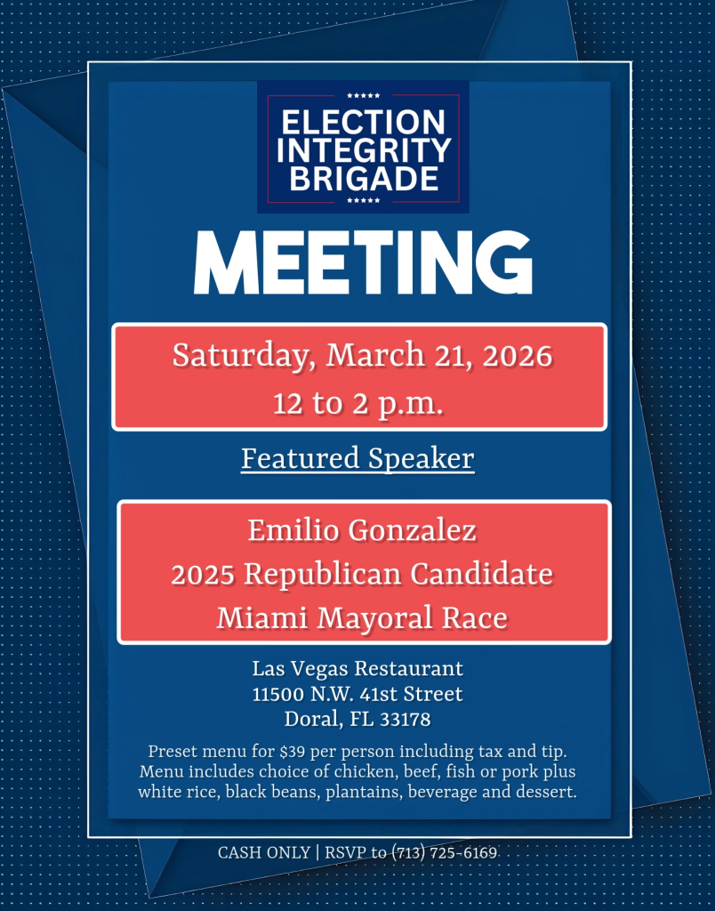 Dear Fellow Patriots, please join us this coming Saturday, March 21st, for our monthly meeting , see attached Agenda for details. Special guests, Emilio Gonzalez, Republican candidate last year for Mayor of the City of Miami; Skip Quintero, candidate for Miami-Dade County Commissioner, District 2; and Diana Castillo, REC Committeewoman from Miami Beach, will be presenting. We will listen and have open discussions about how we can support transparent and lawful elections, what we can do to strengthen public confidence in our electoral system and getting people involved.
