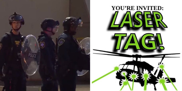 The flyer stated, “Every night for weeks we are forced to listen to the threatening rhythm of helicopter blades as the federal regime spies on us. The only limit power knows is our refusal to submit. This Saturday, October 11th, at 9pm you are invited to fight back. All you need is a laser. Leave home – they can see where the laser is coming from. Go to a park, a field, or some other public place, and once the clock strikes 9 unleash your beam at the cop copter. Mask up. Coordinate with friends to throw a laser party.”