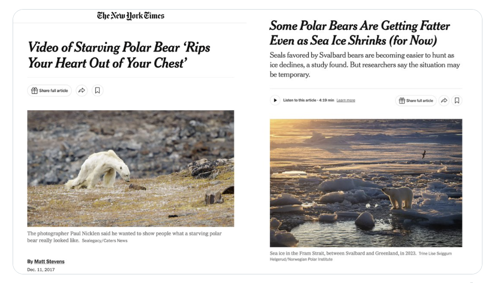 Show me a climate claim, I’ll show you a lie: In 2017, the NYTimes reported that global warming was emaciating polar bears. But today, we learn, it’s actually making them fatter. https://t.co/eQagtcjZxZ pic.twitter.com/KtgcGtZXFy