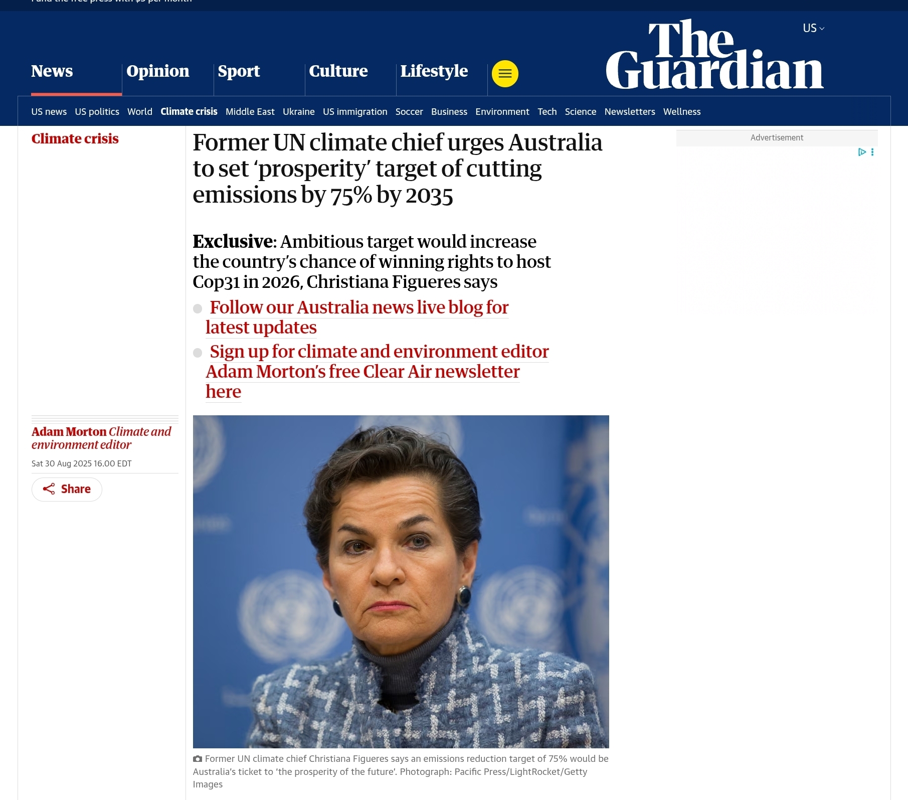 Figueres said setting a target of a 75% or more reduction would be “not a burden”, but instead be “Australia’s ticket into the prosperity of the future”. She suggested the ambitious goal would increase Australia’s chance to win the rights to host a major UN climate summit in Adelaide in November 2026.