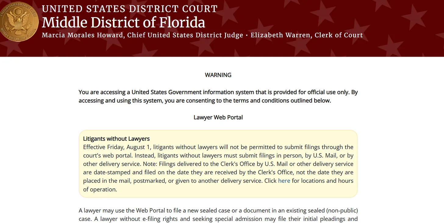 The U.S. District Court for the Middle District of Florida prohibited pro se litigants from using the CM/ECF (Case Management/Electronic Case Filing) system, raises serious constitutional and procedural concerns—particularly under the First, Fifth, and Fourteenth Amendments, and potentially violate federal access-to-court precedents.