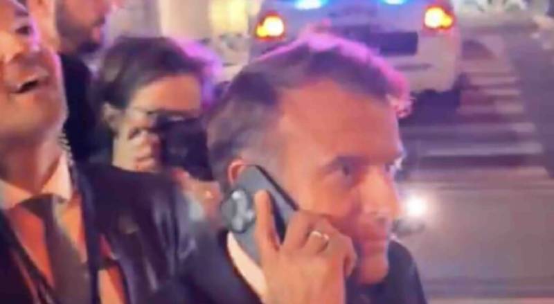 The video shows Macron clasping his phone as he’s shuffled behind a pedestrian gate.