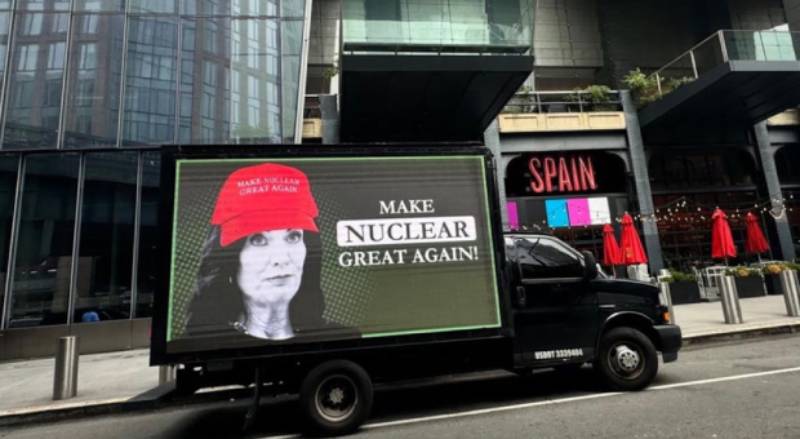 The mobile billboard features images of Hochul wearing a MAGA-style hat saying “Make Nuclear Great Again.”