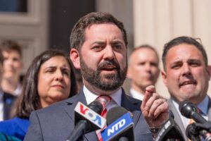 US Representative Mike Lawler speaks during a press briefing at Columbia University in New York on April 24, 2024.