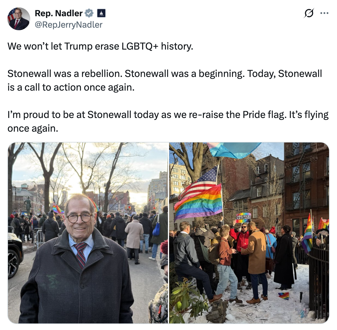 The administration maintains that only the American flag, the Department of the Interior flag, or POW/MIA flags are permitted, not political flags. Pride flags, however, have continued to fly around the Stonewall Inn itself, which sits adjacent to the monument.