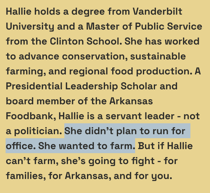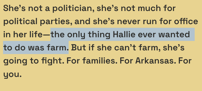 Shoffner has centered her campaign against Republican incumbent Tom Cotton on her farming background. “My whole life, I’ve been a rice and soybean farmer,” Shoffner said in a November campaign video. “She’s not a politician, she’s not much for political parties, and she’s never run for office in her life—the only thing Hallie ever wanted to do was farm,” her campaign site read at the time.