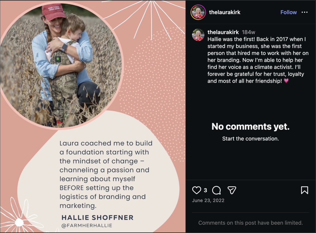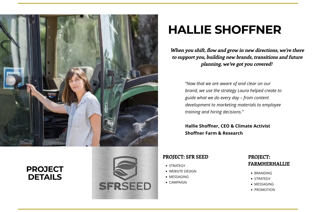 It wasn’t until 2016 that Shoffner returned to the farm as her parents struggled to run it. Around that time, she started working with a local marketing firm to build a “new” personal “brand”: “FarmHerHallie.” Shoffner’s testimonial lauding the firm, complete with a photo of the Democrat posing in front of farm equipment, remains on its website. The firm’s founder identified Shoffner as “the first person that hired me to work with her on her branding” in a 2022 Instagram post.
