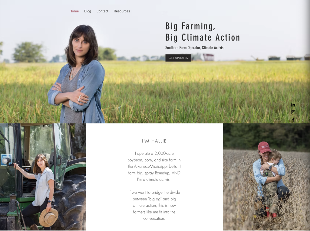 For years, Shoffner published blogs on the website FarmHerHallie.com, which she said would “bridge the divide between ‘big ag’ and big climate action.” The site’s header read, “Big Farming, Big Climate Action” and identified Shoffner as a “Southern Farm Operator, Climate Activist.” Shoffner’s blogs, meanwhile, featured headlines like “What to do about climate anxiety,” and “I’m a ‘big ag’ farmer and I advocate for climate action.”