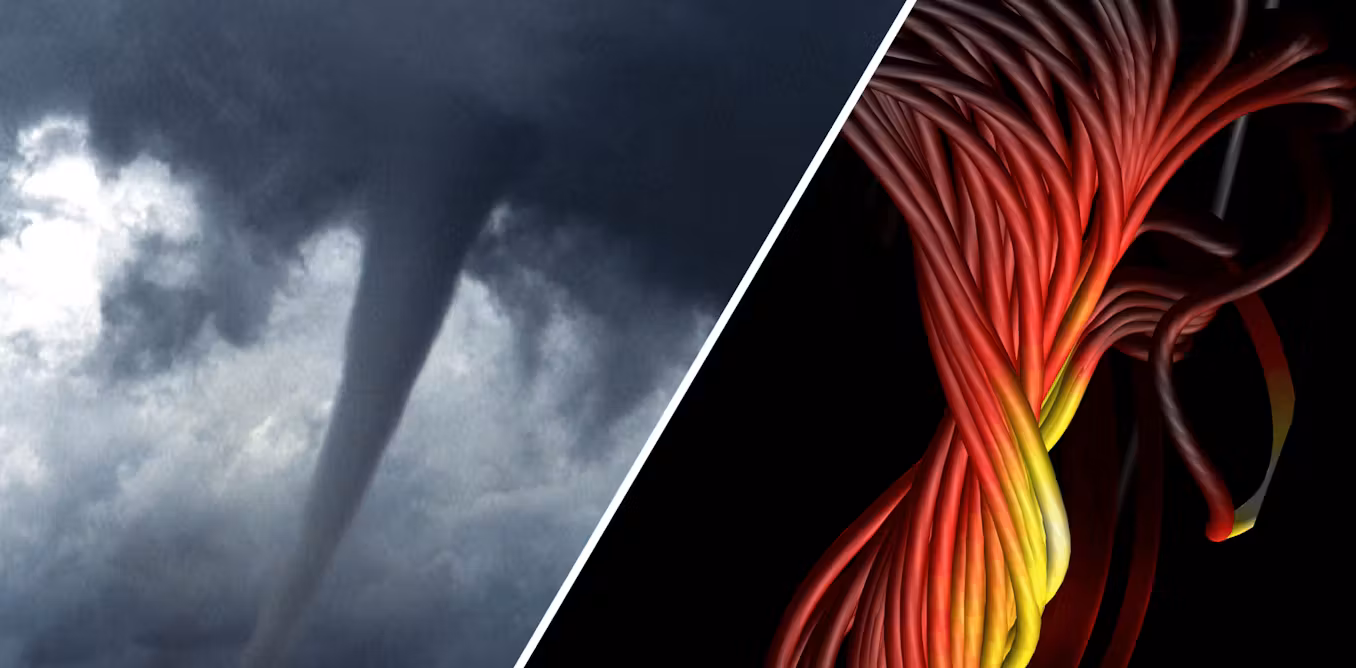 In a study published in October 2025 in the Astrophysical Journal, we modeled one of the sources of these geomagnetic storms: small, tornado-like vortices spun off of an ejection from the Sun. These vortices are called flux ropes, and satellites had previously observed small flux ropes – but our work helped uncover how they are generated.
