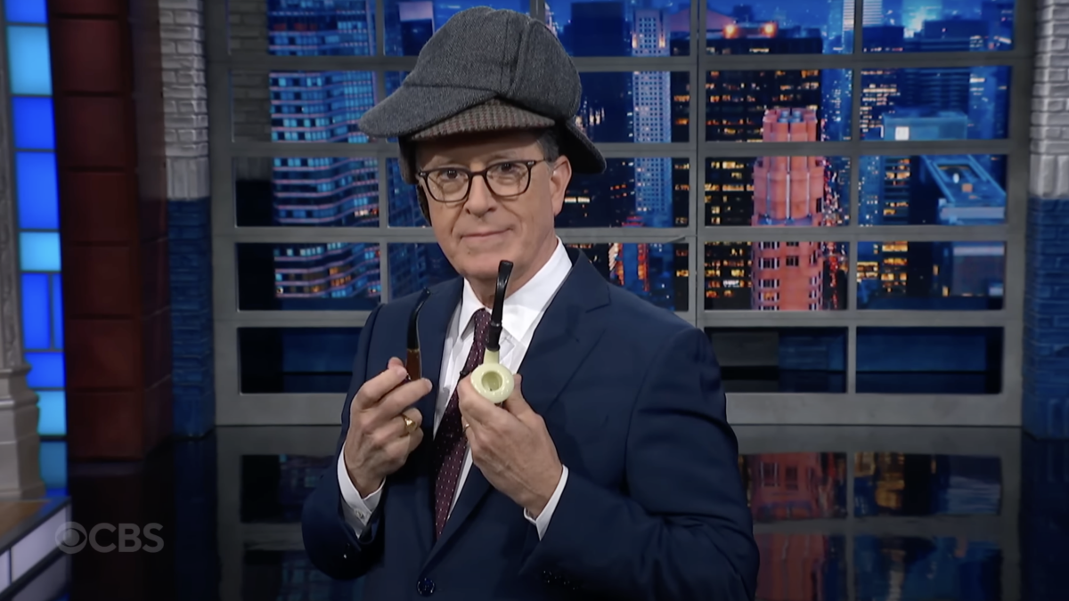 So, on The Late Show, Colbert donned three Sherlock Holmes hats and three Sherlock Holmes pipes as the characters of “Escalator Investigator,” “Teleprompter Investigompter,” and “Ineffective Acoustics Detective Sleuth-Fix” to get to the truth of the matter.