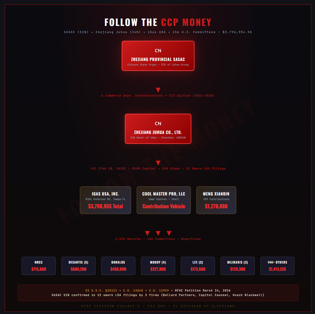 The question is whether Zeldin’s DOJ would be different. The factual predicate is there. The EPA enforcement record documents the violations. The Commerce Department de facto control determination has been sustained for twelve years across four administrations, beginning with the 2014 SOE finding. Sixteen independent federal proceedings, filings, and determinations confirm the Zhejiang Juhua/SASAC ownership chain. The FEC has opened MUR 8439. The Rivera prosecution has proven the money laundering theory in federal court. The OFAC designation petition I filed documents $3,796,954.55 in contributions to 156 committees and over $410,000 in lobbying fees, targeting Zhejiang Juhua and eleven U.S. affiliates for blocking under Executive Orders 13848 and 13959.