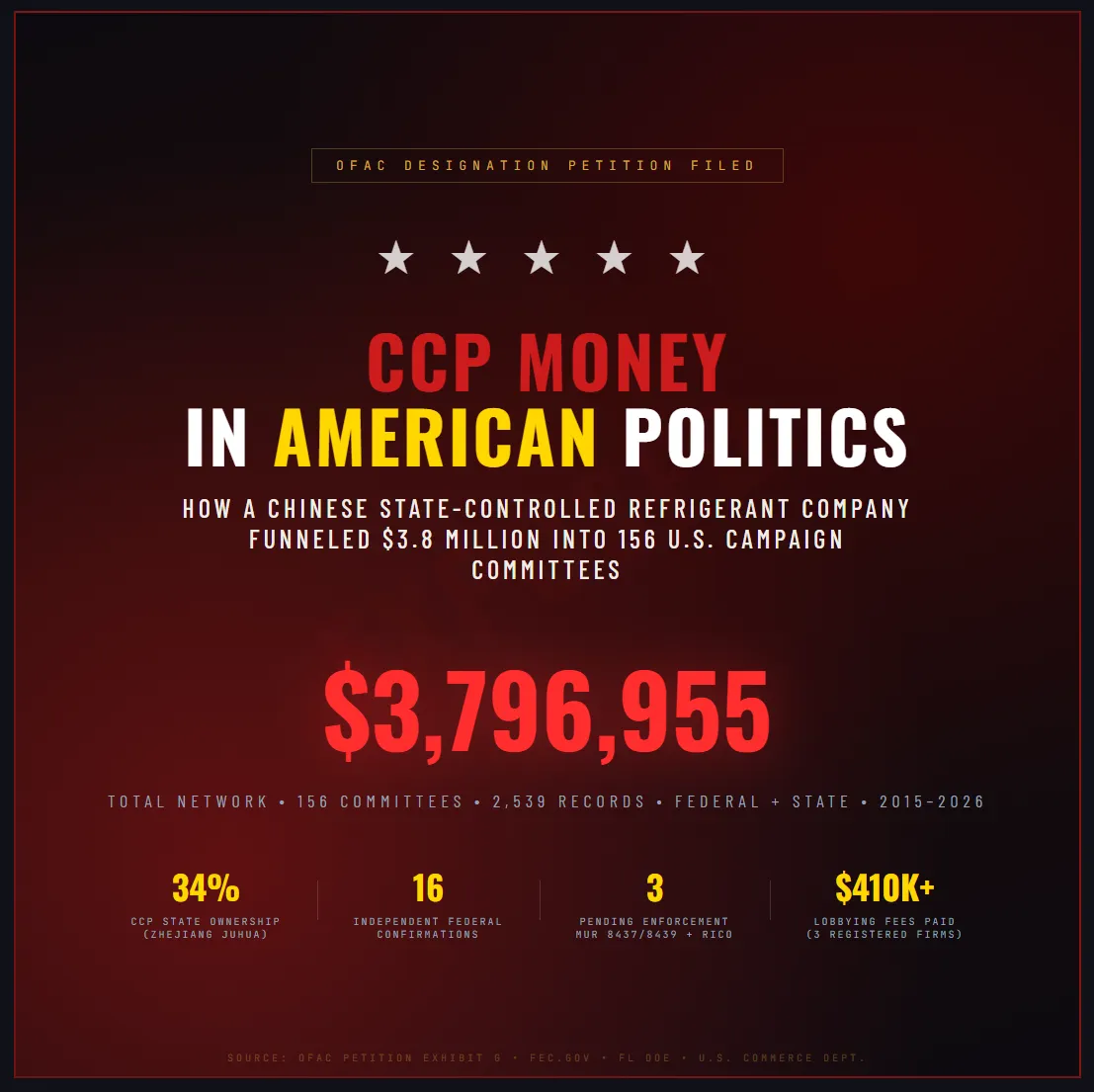 - OFAC Designation Petition: Zhejiang Juhua and 11 U.S. affiliates, $3,796,954.55 to 156 committees, 16 independent federal confirmations of ownership chain