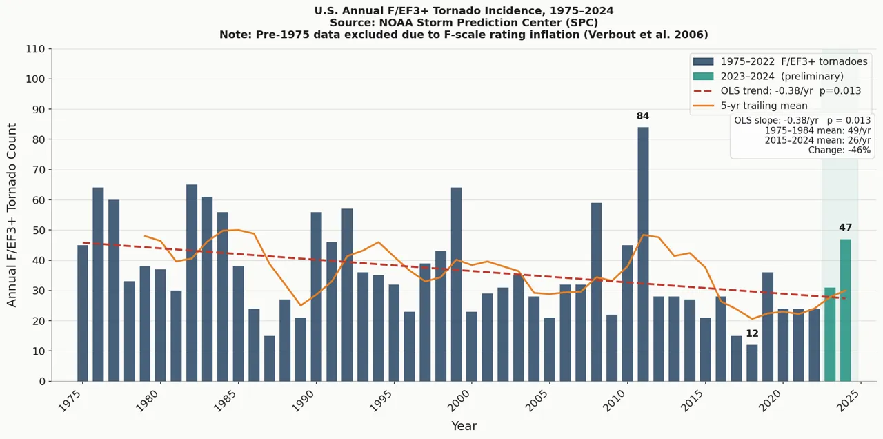 The time series shows a clear decrease in major tornado incidence. The 1975–1984 decade averaged 49 F/EF3+ tornadoes per year; the 2015–2024 decade averaged 26 per year — a decline of roughly 46 percent. Note that data available back to 1954 makes this decrease look much larger, but is accompanied by questions of data quality.