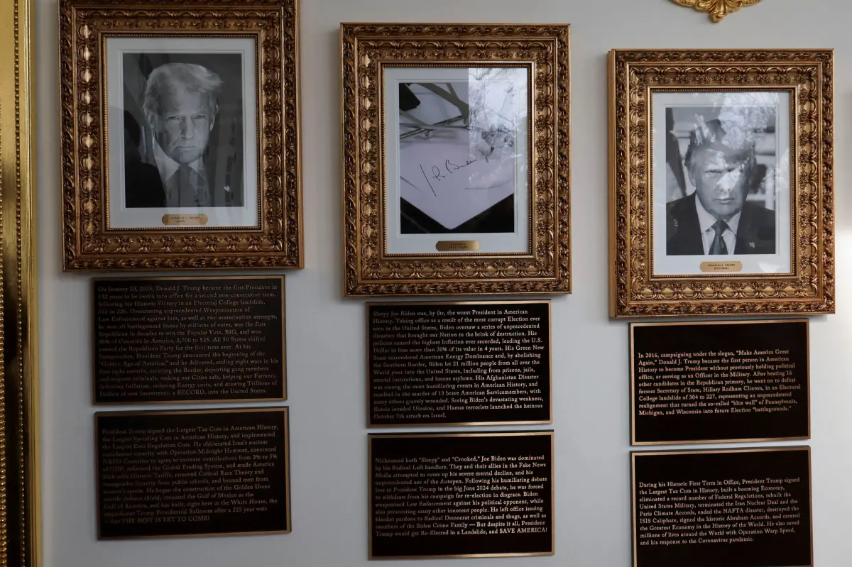 Sandwiched between Trump portraits, he is described as “Sleepy Joe Biden … by far, the worst President in American History” on two newly placed bronze plaques under his autopen portrait.
