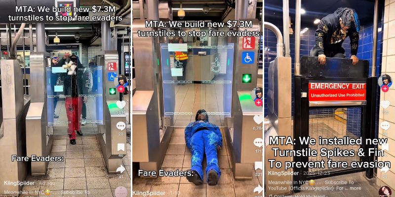 Another fare evader who has recently gone viral is Brooklyn content creator Kiingspiider (@officialkiingspiider), who has posted TikTok videos of himself and his friends riding scooters through entrances, performing Spider-Man-style vaults, prying glass doors open, and tossing a bonnet over sensors to trigger alarms while swinging through the turnstiles. In an interview, he told Fox5NY that the city needs “to focus more on safety and the service of the subway system,” rather than flashy new barriers.