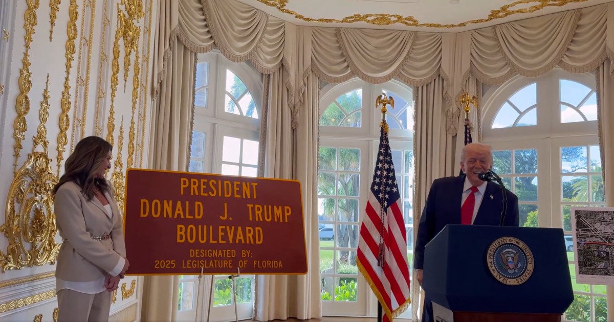 In December 2025, the stretch of Southern Boulevard that runs from Mar-a-Lago to Palm Beach International Airport in Palm Beach, Florida, got a new, additional, ceremonial name: President Donald J. Trump Boulevard.