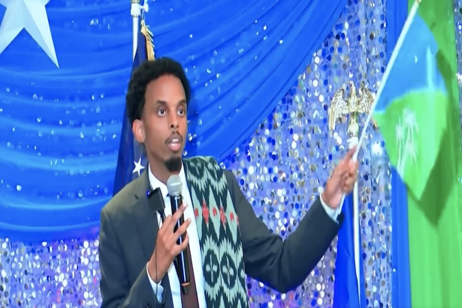 He delivered the remarks while waving a Somali flag in front of a similarly-themed background as Somali music played in the background. There was at least one American flag on the stage, which was nestled between multiple Somali flags.