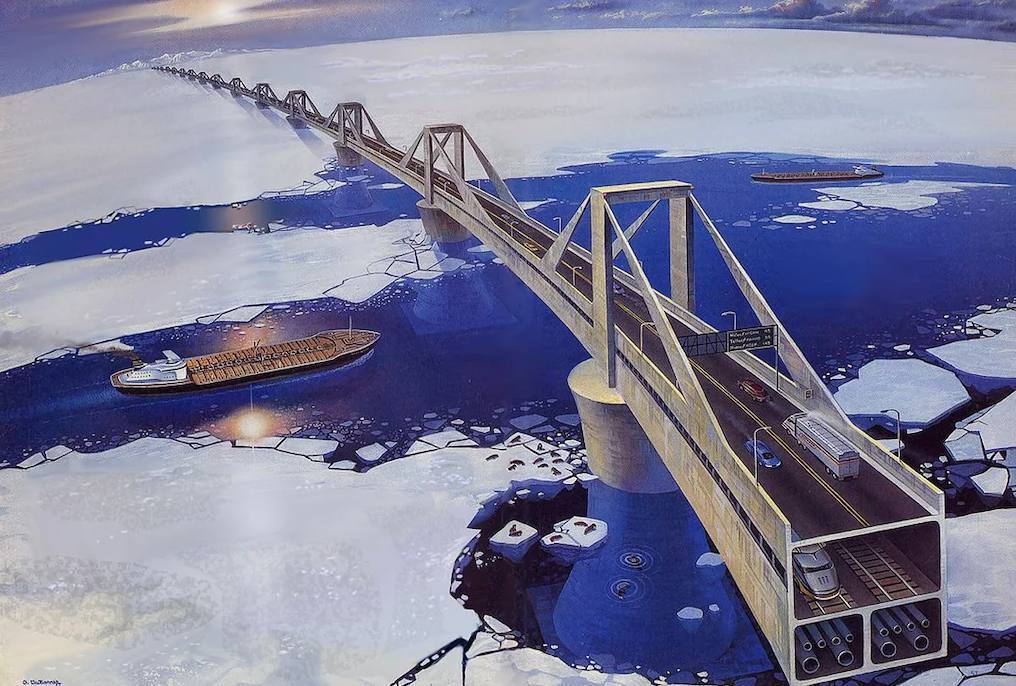 In 1958, Chinese-American engineer Tung-Yen Lin proposed building a bridge across the Bering Strait “to strengthen trade and understanding between the peoples of the United States and the Soviet Union.” In 1986, he presented the “Intercontinental Peace Bridge” project to US President Ronald Reagan. He estimated the bridge’s cost at $1 billion; in 1994, he updated his estimate to over $4 billion (photos 1, 4, 5).